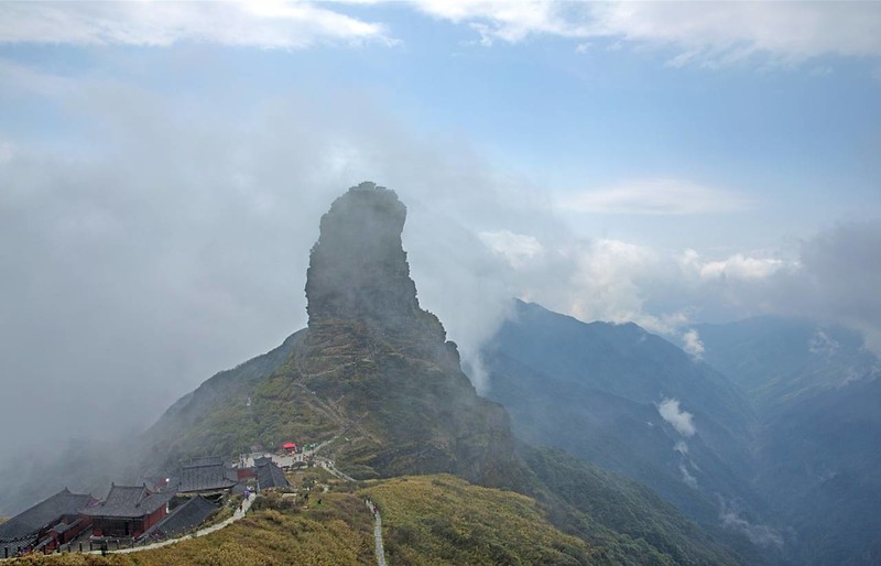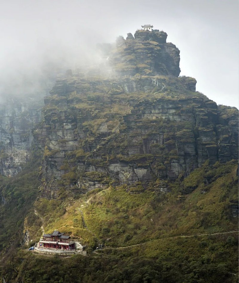 其实,海拔2000多米的梵净山顶不仅有玉树临风的蘑菇石,而且还有为天地点赞的酷似大拇指的山峰——红云金顶。这个垂直高差达百米的孤峰,在顶部中央疑似被神斧劈开,伤口有十多米深,前人为两个山头架起天桥,左右各建一庙,一边供奉释迦佛,一边供奉弥勒佛。由此印证现在佛向未来佛的交替。而红云金顶的得名,有人说是因为朝夕云霞映照,也有人说是朝拜的香火烧到了云天之上。攀登红云金顶,山路陡得要用双手爬,恐高症患者最好别攀登。不恐高的人一定要去体验孤峰绝壁之上当一个“武侠高手”的快感。若有雾来,这种感觉就更好了。