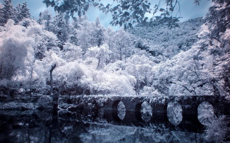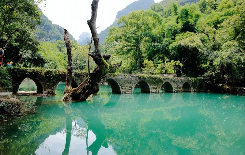 小七孔得名于小七孔桥,这座横跨响水河的古桥建于清代道光十五年(1835年),桥面不宽,原来只是两岸布衣族、苗族、瑶族人的步道。上游奔腾的河水到了小七孔桥就安静了下来,河面幽幽泛着绿光,倒映着七孔桥洞,煞是好看。