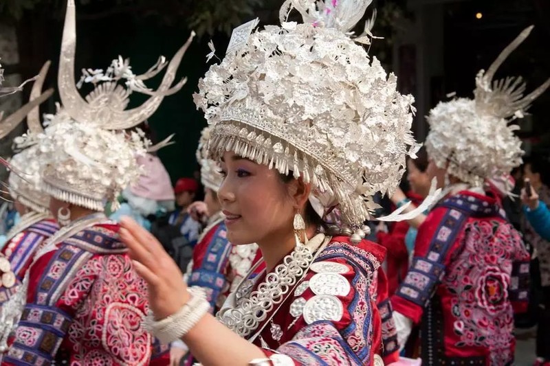 穿苗族服装、戴银饰