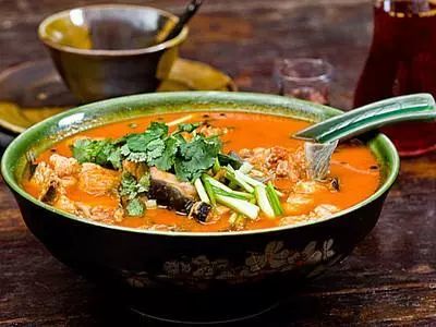 在西江千户苗寨的万家灯火中品尝红艳的酸汤鱼,感受深山里的人情温暖。酸汤鱼火锅是苗族人的看家菜,在迷人的夜色中享用尤其能品出真味。