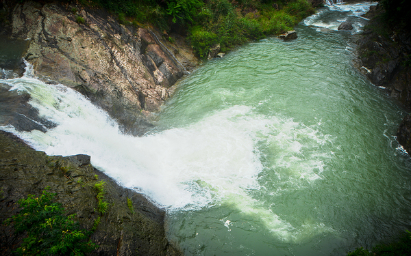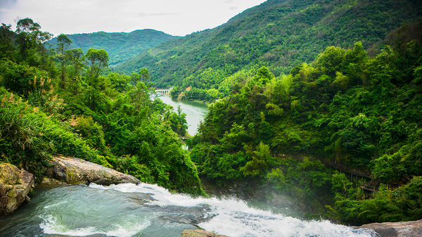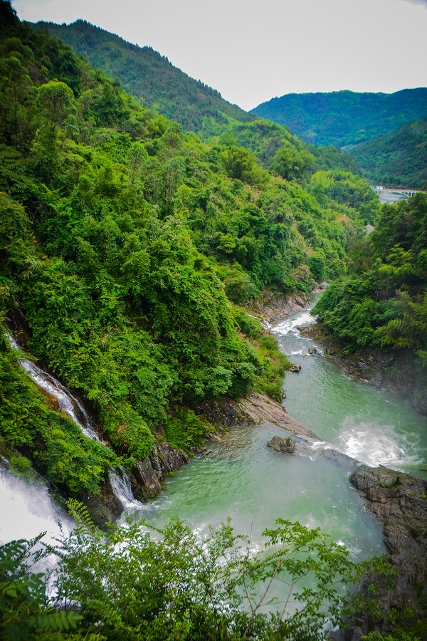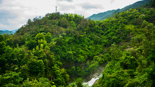 直至转弯遇见“瀑”,伴随着越来越响的瀑布声,才发现原来这里藏着这么大一个瀑布。之所以在山脚下并未发现,是因为从玉龙湖积蓄的水在山顶水库停留,三次曲折倾泻而下,径直汇入 横阳支江,因此看不到;而瀑道随着山体弯曲,被密林所遮挡,也阻隔了隆隆的瀑布声,因此也听不到。