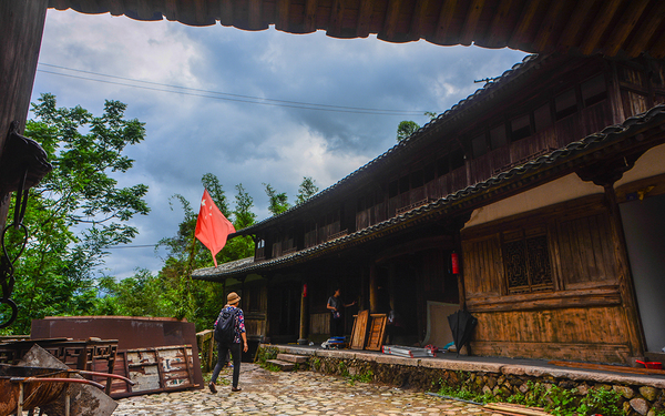 巡径直上,登上半山腰处,有一块一亩见方大小的场地,四周老屋如梯田式的一排一阶搭建。这是村中风景最佳的地点。恰逢梅雨季,雨后天空仍然氤氲。突然有一种“宠辱不惊,闲看庭前花开花落;去留无意,漫随天空云卷云舒“的似曾相识。时光如随风飘逝的浮云,转眼回眸,身后便是百年古村。