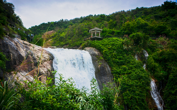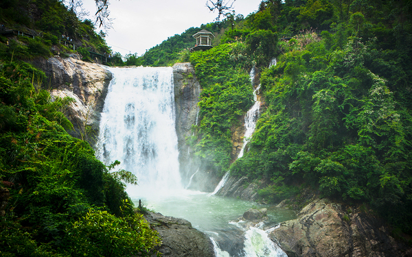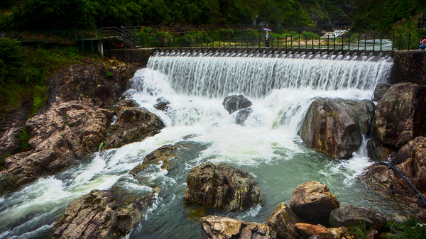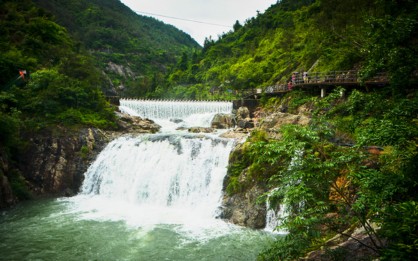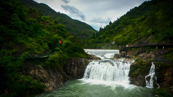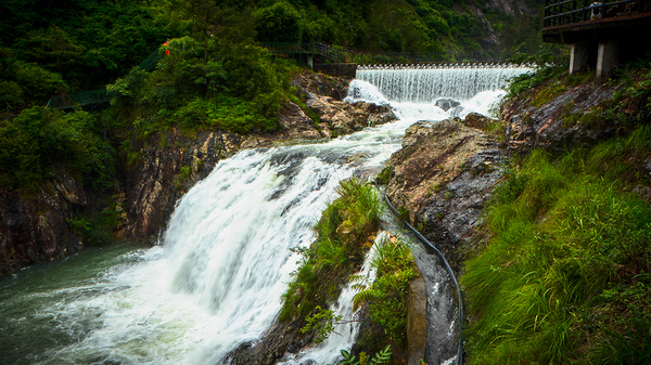 远看确实像黄果树瀑布,不过那是天然的,这里因为近年来修建了水库,也人工修建了闸口和索道,所以并不是那么原汁原味。但黄果树瀑布高度也只为77.8米,其中主瀑高67米;瀑布宽101米,其中主瀑顶宽83.3米。三折瀑的垂直落差百米有余,而且水量充沛,甚至比雁荡山大龙湫更壮观。