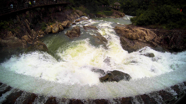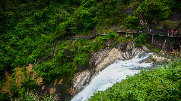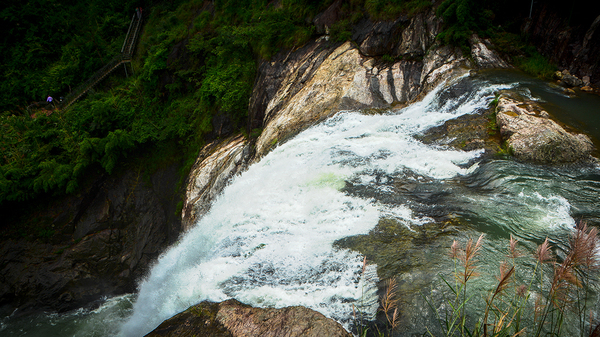 飞溅的水花,在最高折处,被山谷气流吹起。直面吹到了五十多米开外的栈道上。