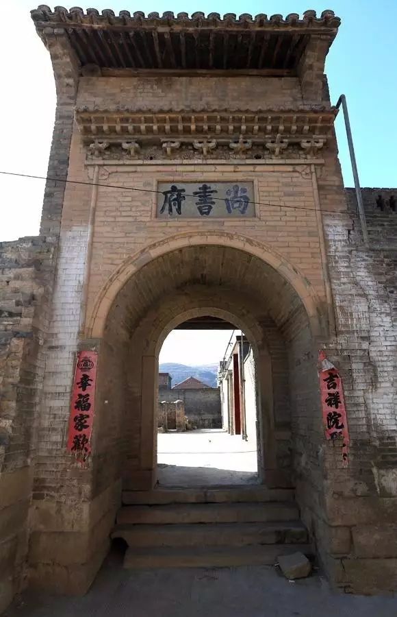 尚书府分为上下两座宅院,上宅总体布局为棋盘六院,府门朝东,高9米,宽5米,高大峻伟,门头以砖雕斗拱装饰,石匾阴刻“尚书府”。