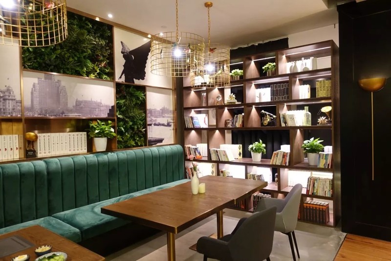 餐厅风格延续着老上海的摩登与复古风,头顶的每一盏灯的设计都极为考究,靠走廊一侧则设计成了书柜,用餐时,你可以随手选一本好书阅读。