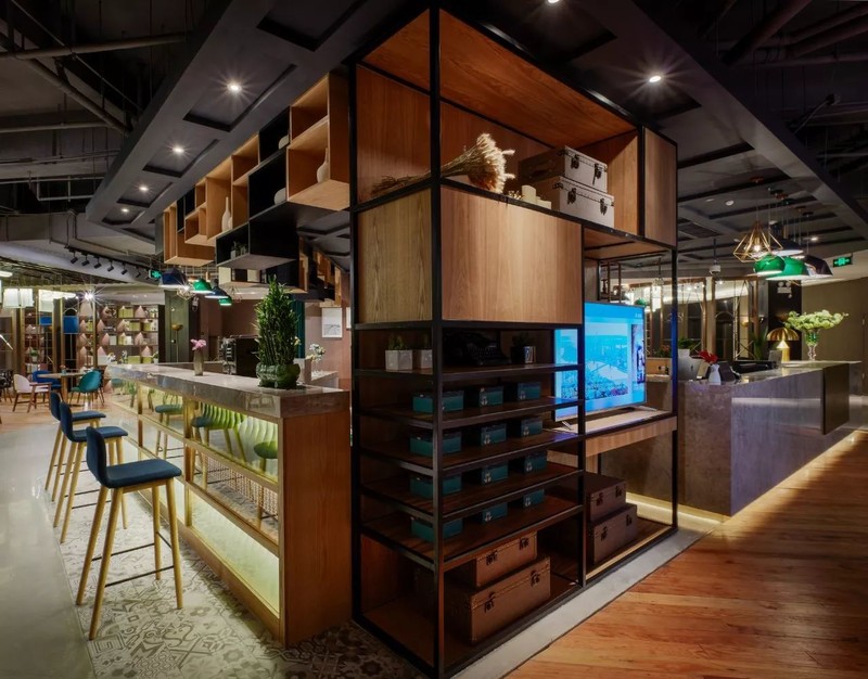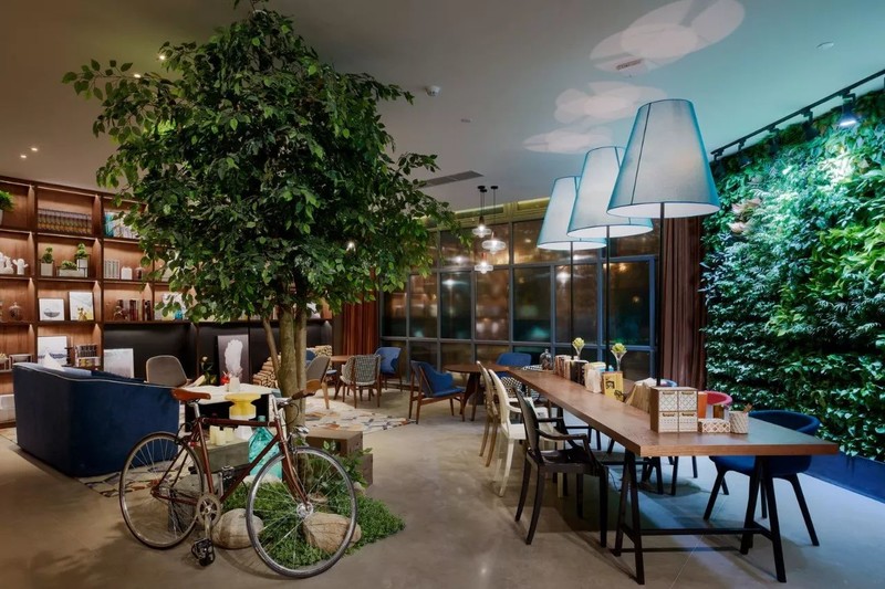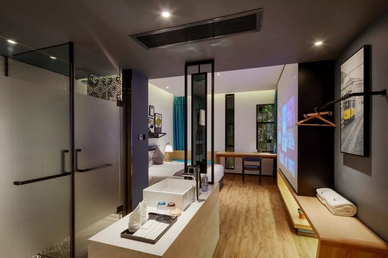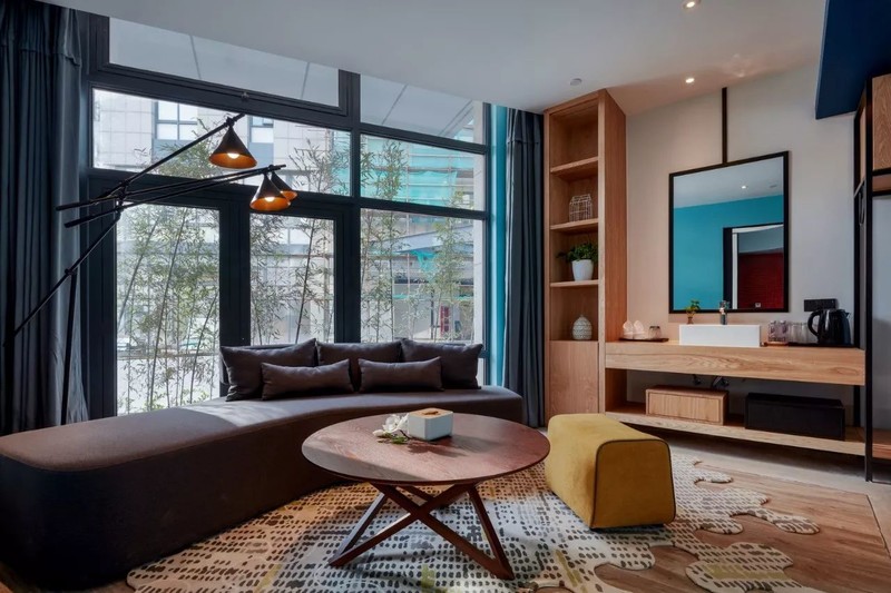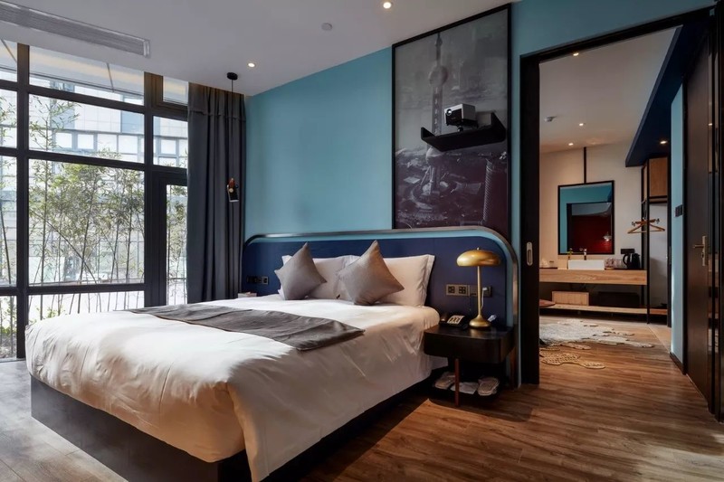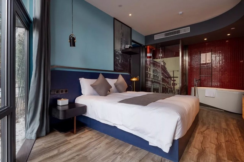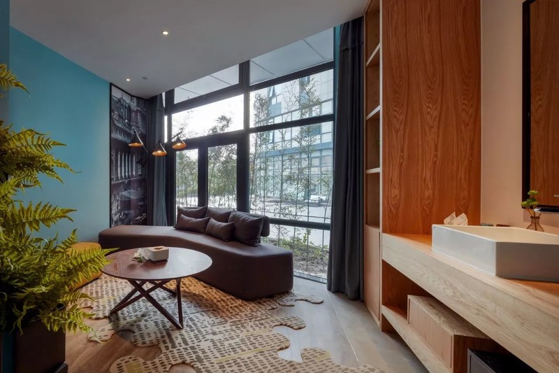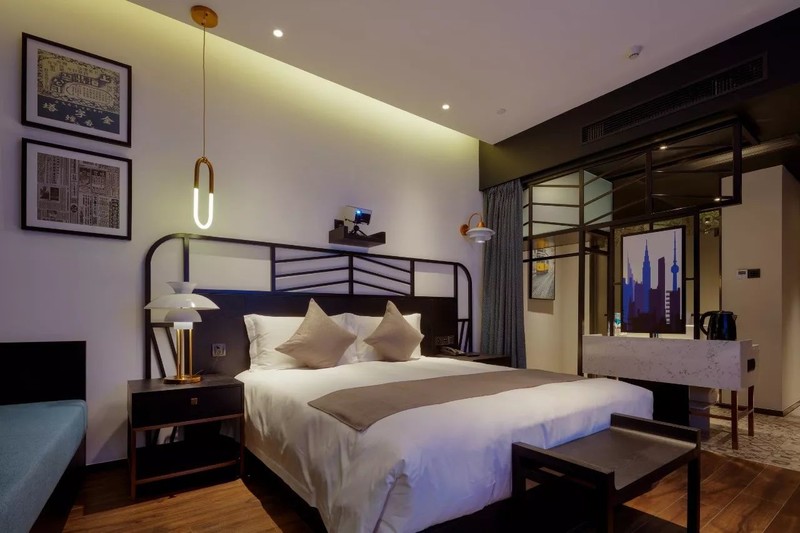 复古单车、撞色沙发、金属筒灯……酒店的装饰、家具、布设都从细节上都透露出浓浓的摩登工业元素。一座城市被浓缩在一个空间,正呼应了云隐行旅酒店的“城市客厅”功能,全国乃至全球的游人来到云隐行旅就能感受到上海的温度。