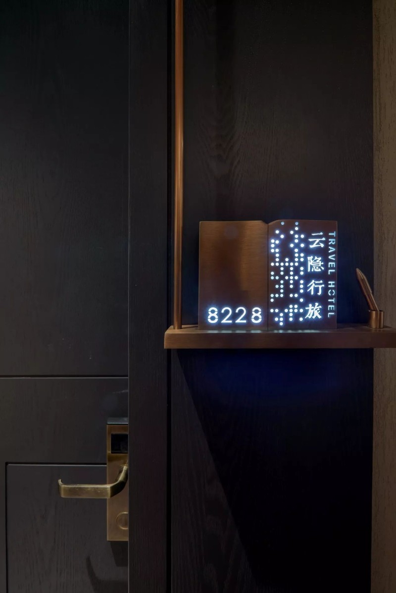 云隐行旅的90间客房的总量不大,但是各具风格。门牌用金属雕刻,并用灯光投影出房间号,设计感十足。