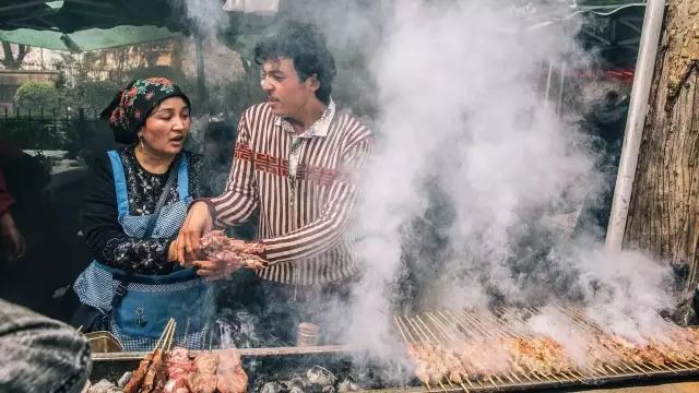 在无数口口相传的述说之中,长寿路附近有一座清真市集,每逢周五,从长寿路拐入常德路或西康路,远远望见笼罩在烟气之中的路口,市集就在那里。不到200米的澳门路架满了摊位,吆喝声此起彼伏,摊头上尽是各色生熟羊肉串、手抓饭、馕、烤包子,以及各种你认识的、不认识的远疆干果、蜜饯、小点,甚至还有宰好的羊,血淋嗒滴挂起来,成了一道天然的招牌……