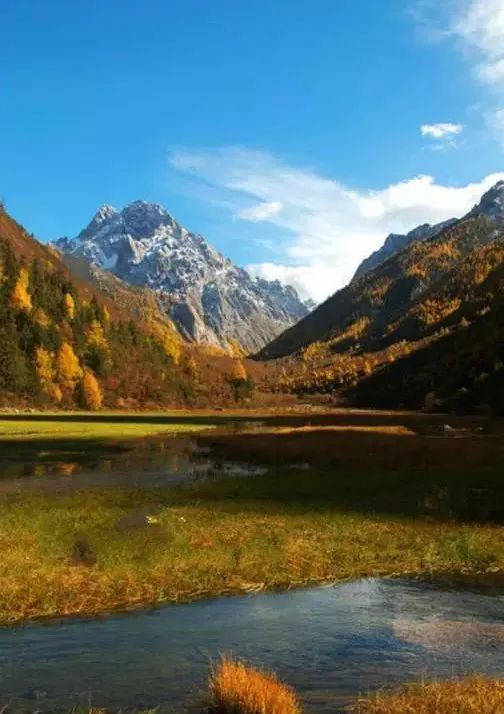相较九寨沟,这里的雪山是别样的美丽。雪山巍峨耸立,映着海子,映着草海,圣洁超脱,宛若世外之境。