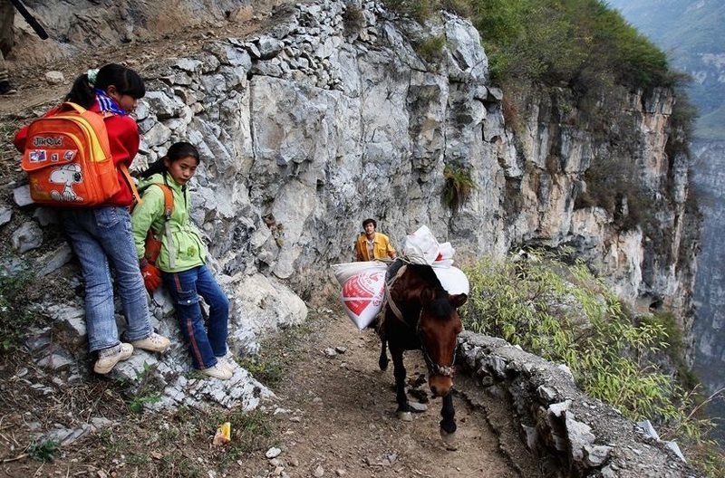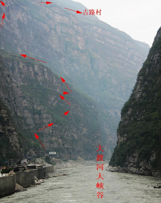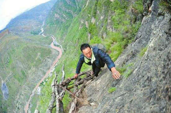 古路村人想要到外边去,就只有一条路可走,就是从悬崖下到大渡河边。陡峭的崖壁上到处是用木棍结成的梯子,木梯都不能用的地方则用藤绳。他们上下山还要背是上百斤的山货用于换盐,换布,在上下山的途中,稍不留神就会跌入悬崖。