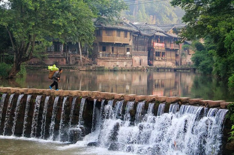 望鱼古镇的主要建筑坐落在突兀于山腰的一块巨石之上,因巨石形似一只守望着周公河游鱼的猫而得名。
