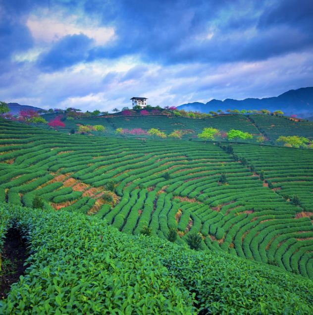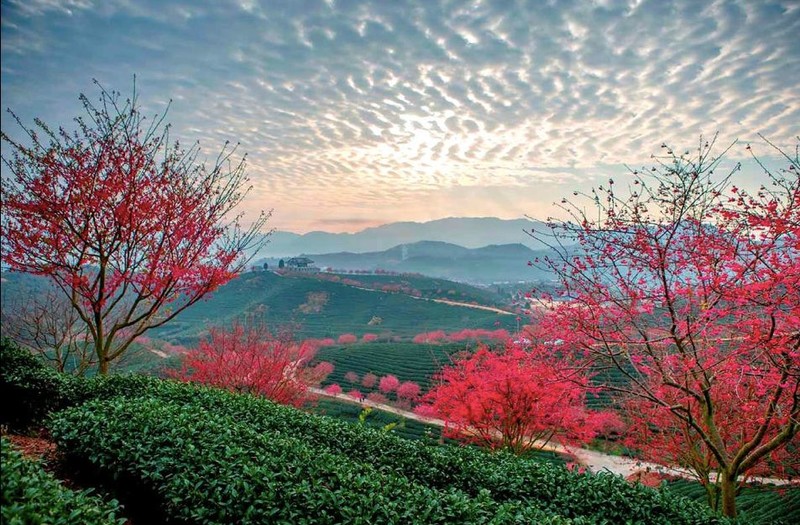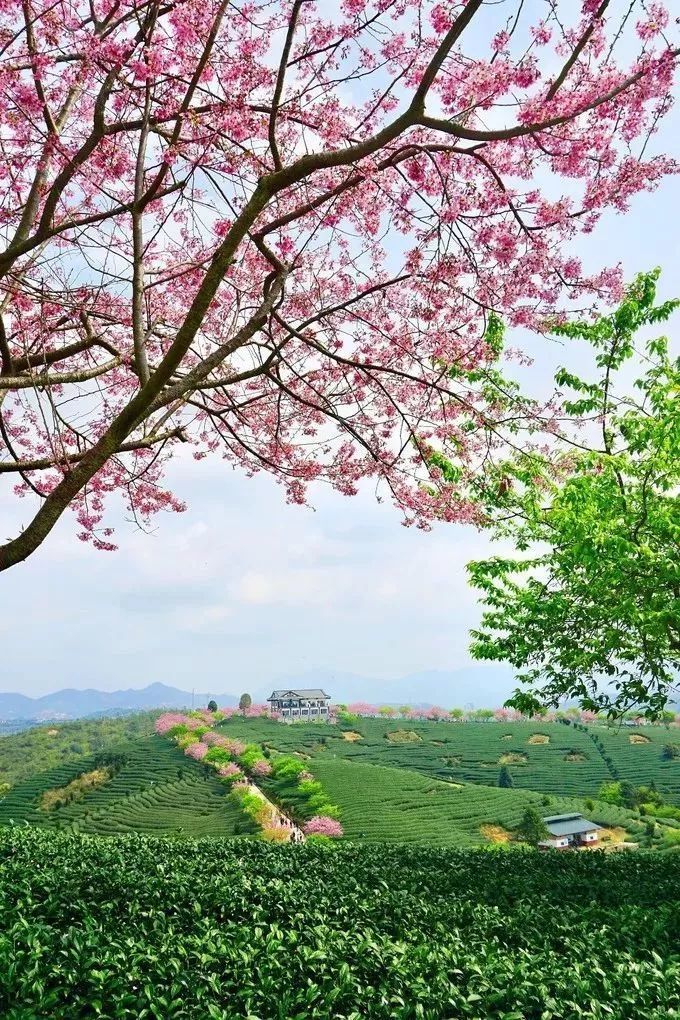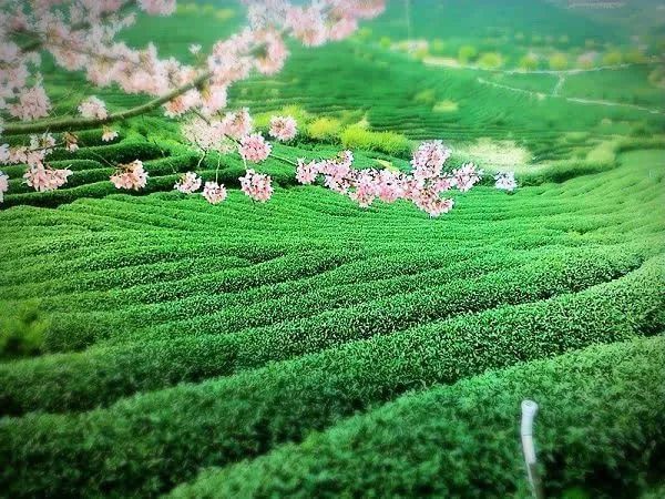 永福樱花园的樱花是连着两片茶山山头种植的,5万亩的绿色茶园里,一排排茶树组成了齐整的线条,高低起伏,错落有致。