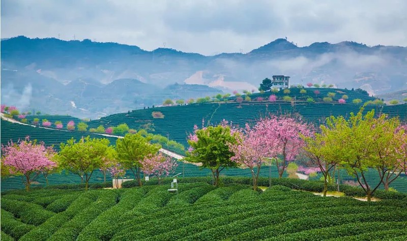 雨后,层层叠叠的茶山与粉红的樱花海,在腾腾升起的雨雾中若影若现,如梦似幻。