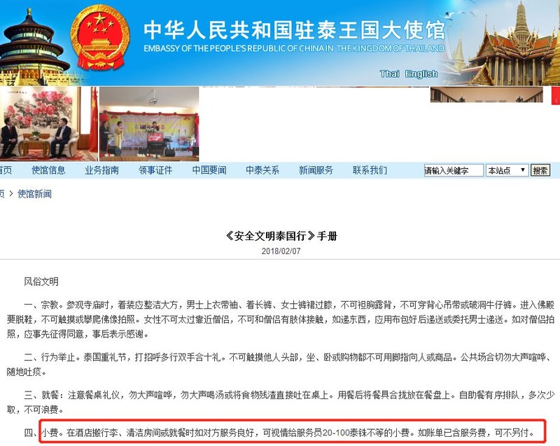 据了解,泰国小费文化由来已久,由于东南亚国家经济发展水平参差不齐,服务人员的薪资待遇较差,给他们一些小费也是人们约定俗成的规矩。就连中国驻泰国大使馆对游客的特别提醒中,也有一条是关于给小费的内容: