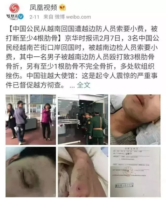 中国公民被越南边检人员索要小费不成,被殴打致骨折。新闻来源:凤凰视频