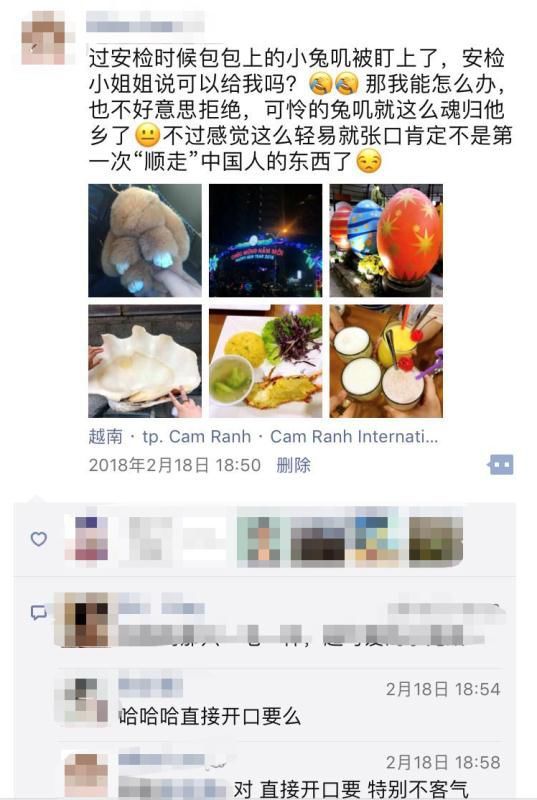 “我的包过了安检,正准备拿的时候她(安检人员)直接指着我背包说这个有问题,然后二话不说夺过去,指着我包上的玩偶兔子,就说这个能不能给我?”小鱼当时表示很震惊,如此张口要东西的情况还是第一次遇到,但由于身在异乡怕被找麻烦,还是点了点头表示同意。“她也没对我说谢谢,只是说了一句新年快乐!”