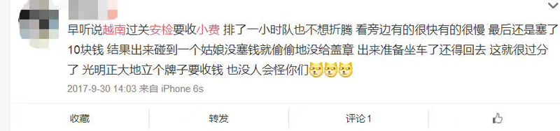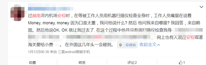 经纬君在微博上搜索发现,很多人都有被越南海关以及安检人员索要小费的遭遇,有人在微博中写到,在河内机场过安检时,工作人员嘴里一直念着“money money money”,而自己说了是来自韩国则可以顺利过关。