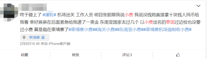 网友爆料在柬埔寨海关被索要小费的遭遇。