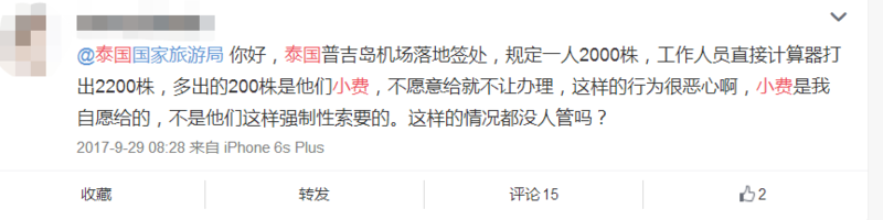 有网友表示在泰国普吉岛机场办理落地签时工作人员直接用计算器打出小费数额。