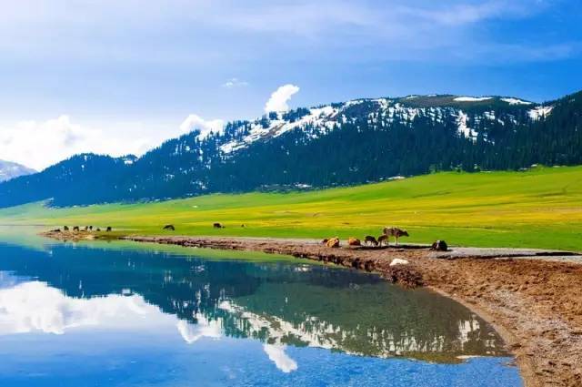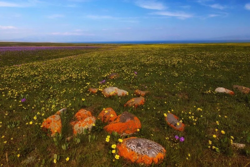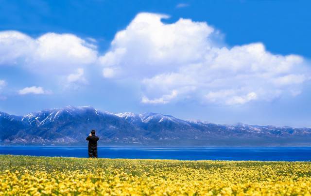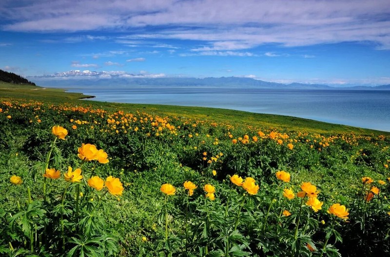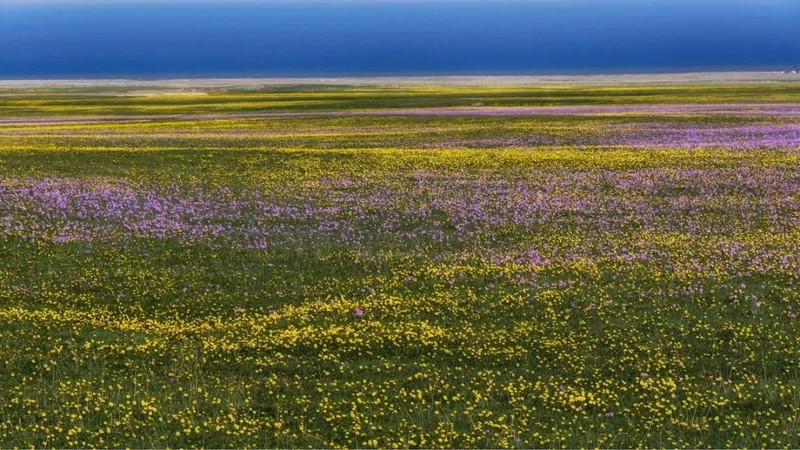 尤其是鲜花盛开之时,各种颜色点缀在绿色的草甸之上,伴着远方分不出边界的蓝天和缥缈的雪山,让人分不清这到底是赛里木湖,还是天堂。