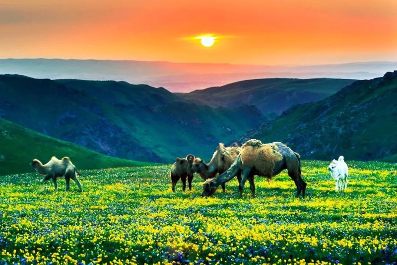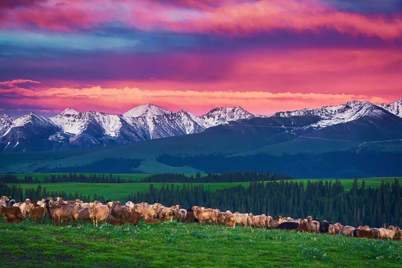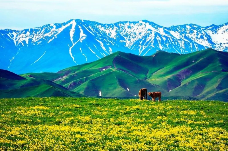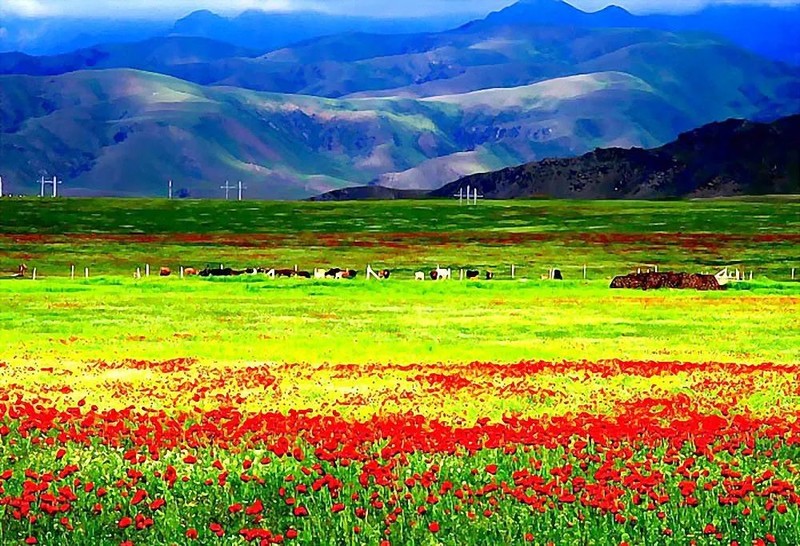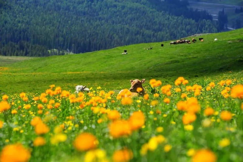 每年5月到9月,上百种天然牧草花朵在不同的海拔依次绽放,或红或白,浅浅地铺在草甸上,近3万头牛羊随意散落在草原的各个角落,悠闲至极。
