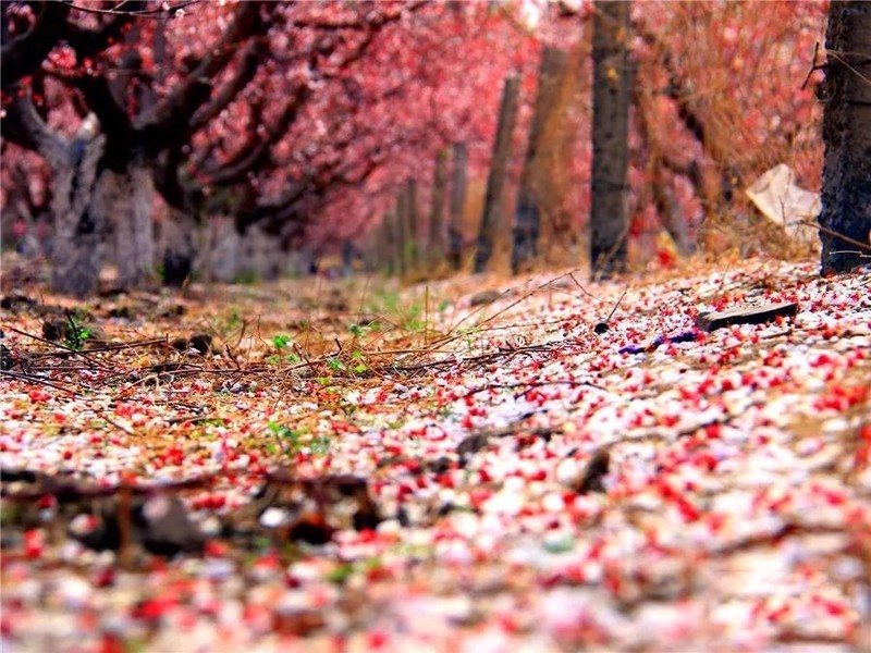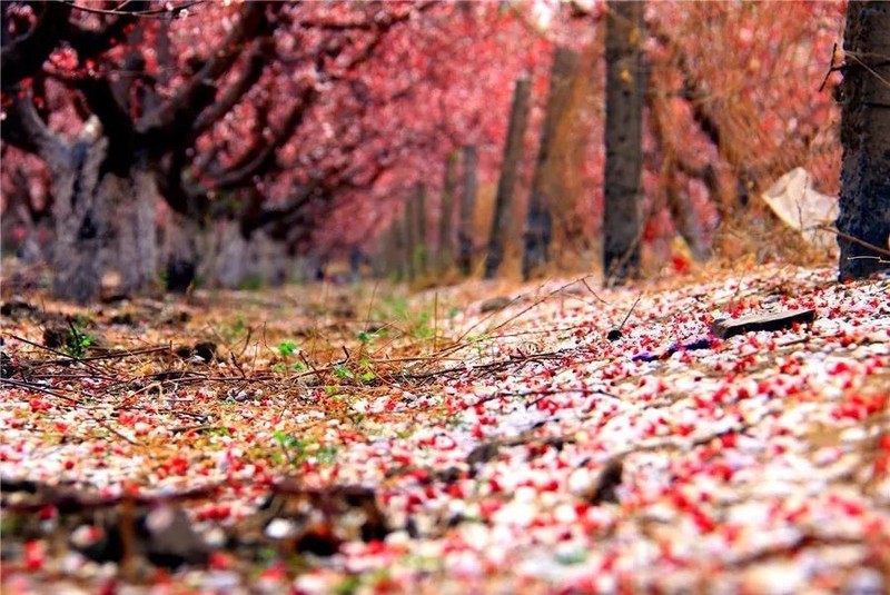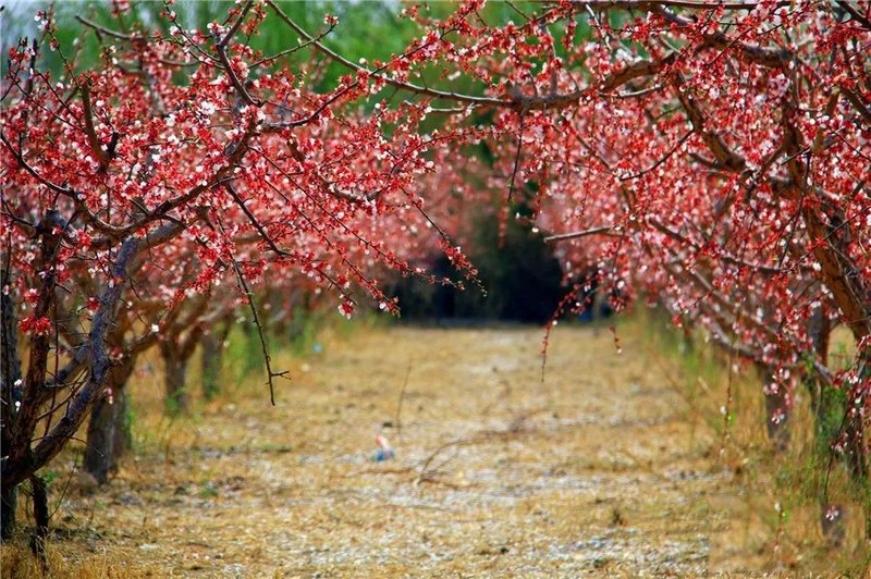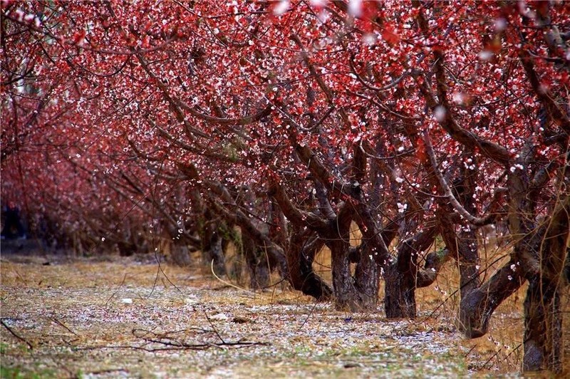 穿过怪石嶙峋的红河谷地,没想到那满树的杏花竟然已经盛开,放眼望去满目殷红,散落花瓣混合着泥土,整片杏林都充斥着春天的味道。