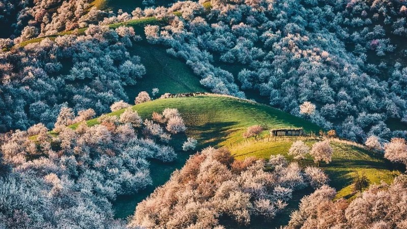 每年5月,杉山坡上的林木花开成海,或白或粉的花朵扑簌而下,落在树下安心吃草的牛羊身上,静谧美好。