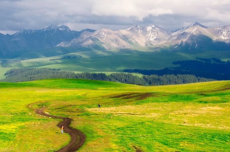 苍茫的草原,蜿蜒的雪山,无边的天空,各种壮阔的原始美在阿克乔克草原一一呈现。