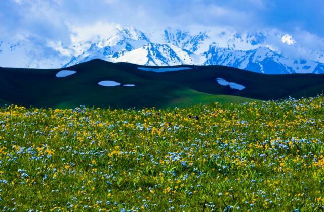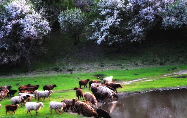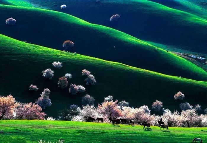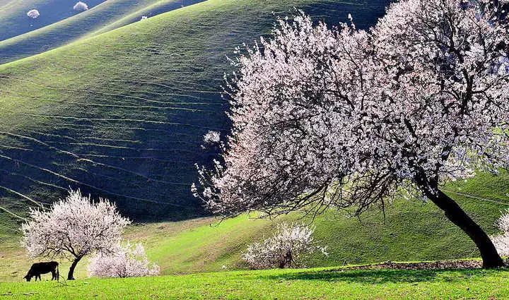 处于群山环抱的伊犁地区四月份虽然山头依然是白雪皑皑,但山间谷地却已春意盎然。