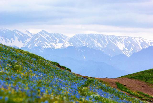 春末夏初,气候的垂直差异使得远处雪山皑皑,而脚下的草原已经遍地花开,各色的小花随风摇曳,洁白的羊群漫步草原间,给人一种人与自然合一的错觉。