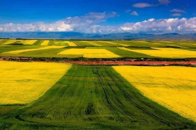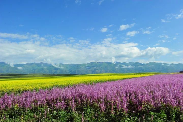 当油菜花盛开之时,在广袤的绿色背景上,一望无际黄灿灿的油菜花镶嵌其中,一片片紫苏花海随风摇曳,在远处连绵的雪山的映衬下显得愈发耀眼。