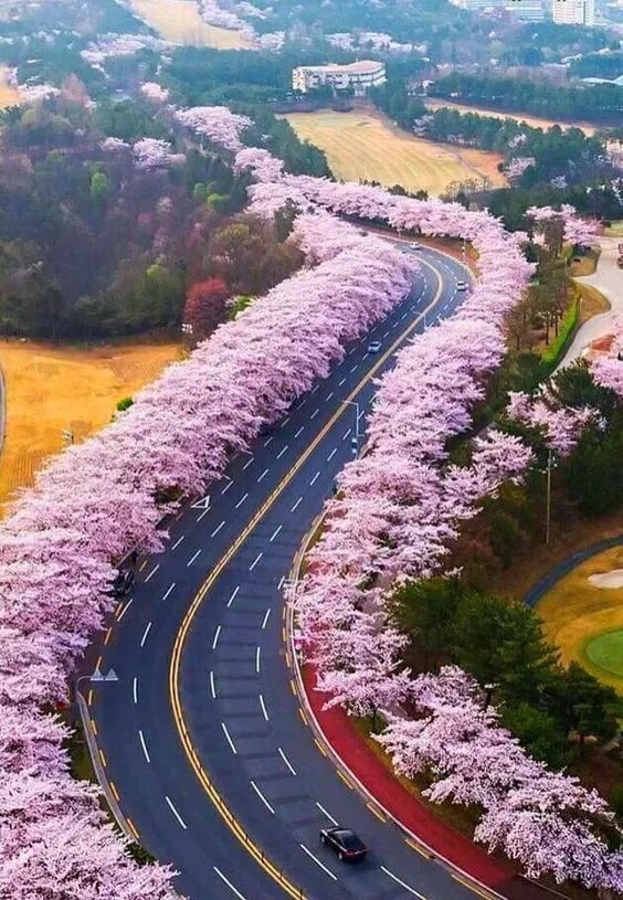春天,整条路生机盎然,路边开满了樱桃花,粉的如霞,紫的如海。