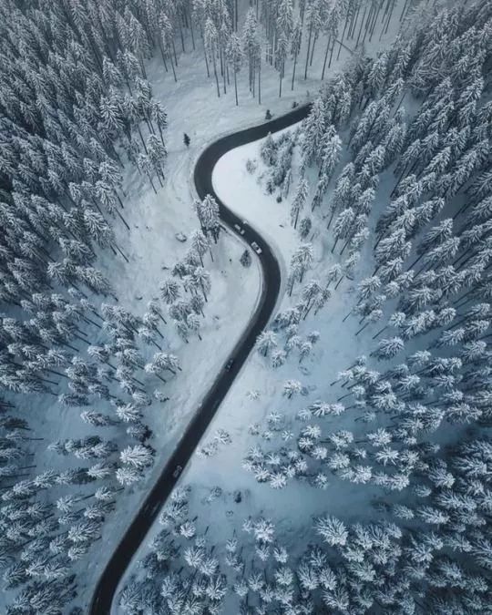 皑皑白雪,成片成片的树木上都挂满了雾凇,路上来来往往的汽车宛如山间一条美丽的传送带。