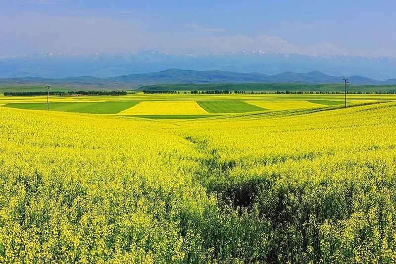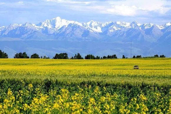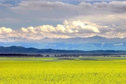 昭苏草原广袤壮美,夏季还有万亩油菜花在雪山下开放。