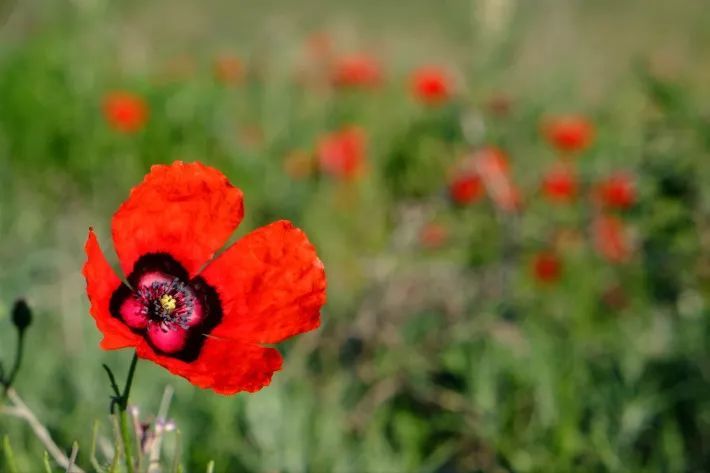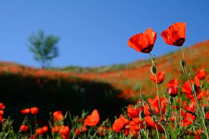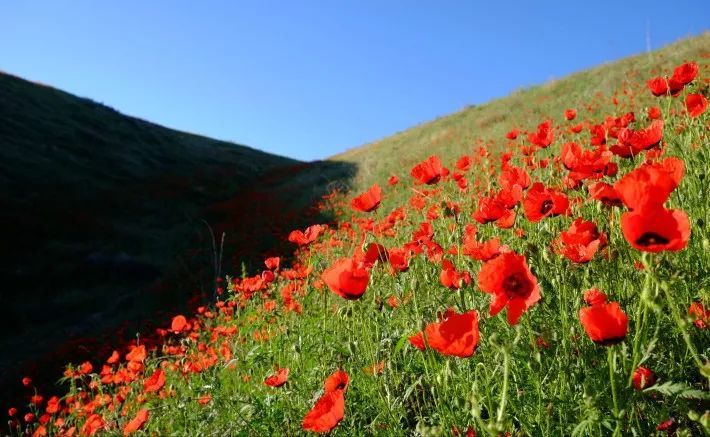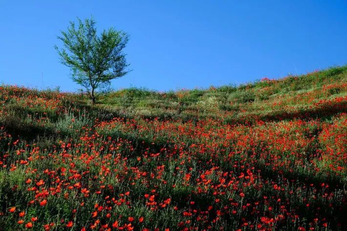 满山遍野的红花开始缓慢的张开胸怀,拥抱着温暖的第一缕晨光。