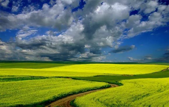在湛蓝的天空下,一望无际的油菜花肆意怒放着,天光云影,在波涛般起伏的浩瀚花海中悠悠飘逝。