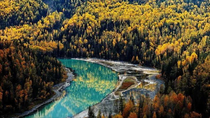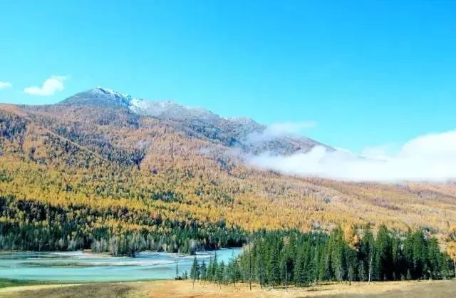 金秋树叶金黄绚烂,而森林背后的山顶此时也开始积雪好像漂亮的雪山,山林河水相映,是摄影的绝佳之选。