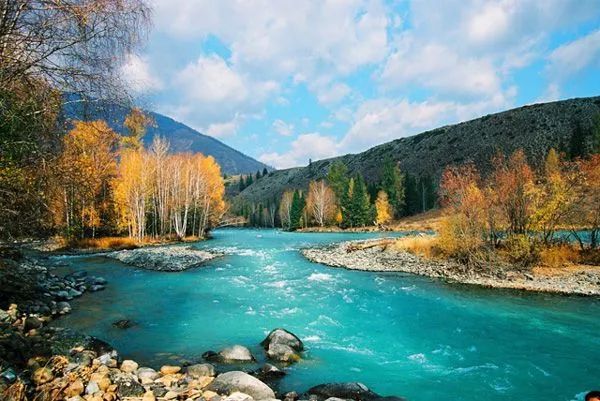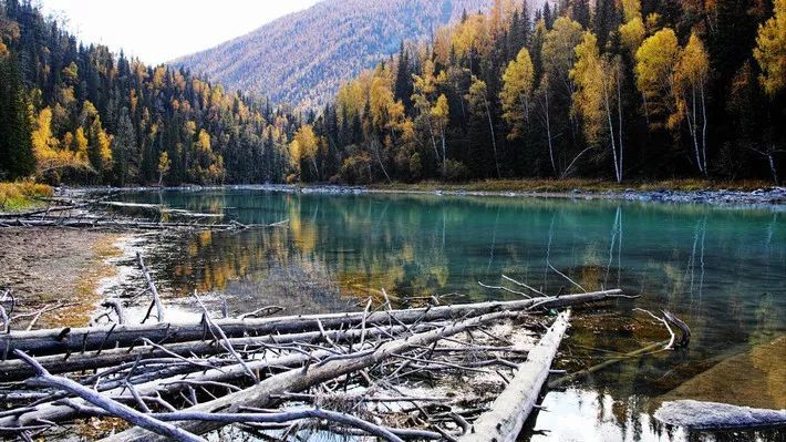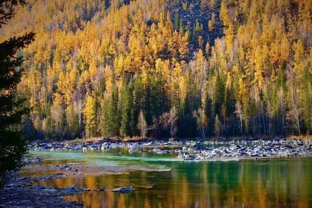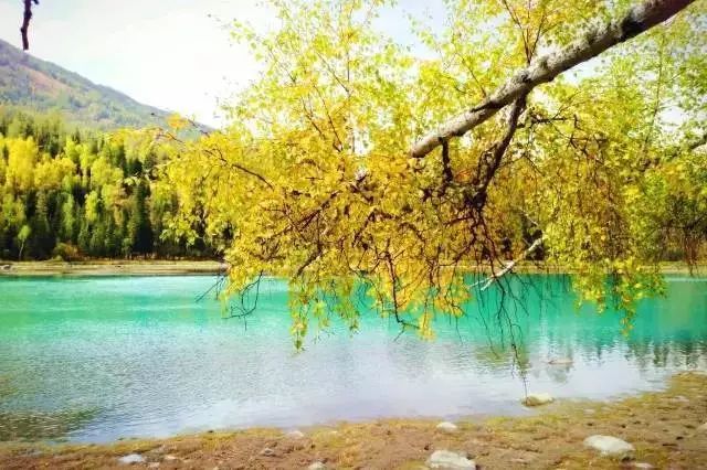 白桦林满地金黄色的落叶,这里是额尔齐斯河的发源地,峡谷幽深,河水清凉,秋天的水是碧绿色的,很是漂亮。