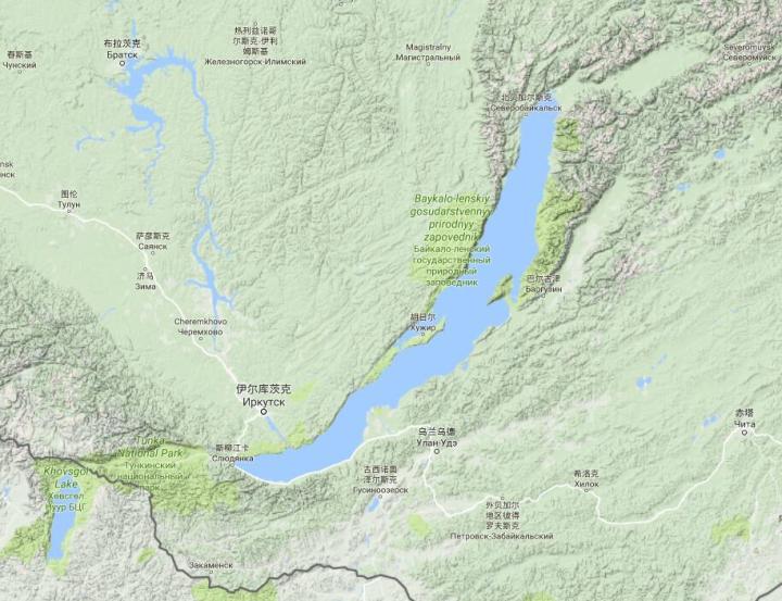 (形似弯月的贝加尔湖四面环山,地图源自Google)