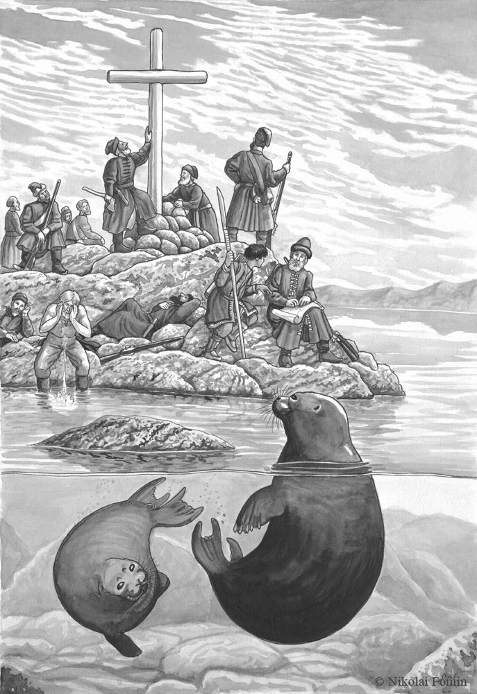 (俄国人绘制的Kurbat Ivanov到达贝加尔湖,呈现出的是对新土的“兴奋”,画师Nikkolainen)