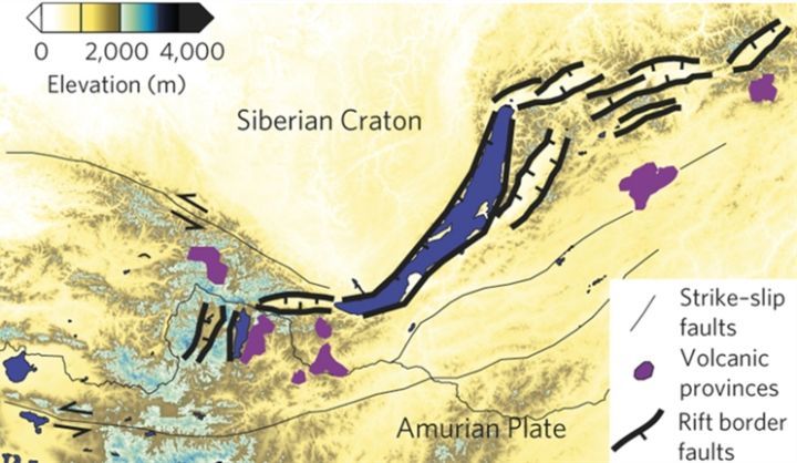 (贝加尔裂谷带示意图,黑线为裂谷边界,图片源自Nature杂志官网)