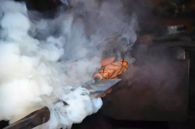 第一次看打铁很是稀奇,只见师傅把烧的通红的铁片敲敲打打成菜刀的形状后往木柄里一插,顿时火苗喷射而出,柴烟滚滚。