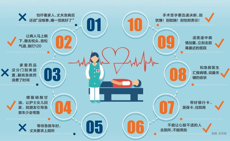 女儿是护士,我赶紧打电话让她立即回家。同时,我打电话找到附近朋友:“我丈夫可能得了心梗,你现在赶到小区门口,看见急救车指引他们一直到咱家,别让车浪费时间,快!”【点评:时间就是生命,必须争分夺秒!】