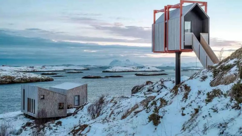 在挪威北部的Fleinvær 海岛上,有一家与世隔绝的木屋酒店Fordypningsrommet,它由九座木屋组成,这些木屋都矗立在礁石之上,仅靠钢索稳稳拉住。每一间屋子的用途都有所不同,其中包括四间卧室、一间厨房、一间工作室、一间浴室、一间桑拿房和一间灵感小屋。如此设计,是为了让客人们无论是想吃饭或是想洗澡,都必须走入自然中。