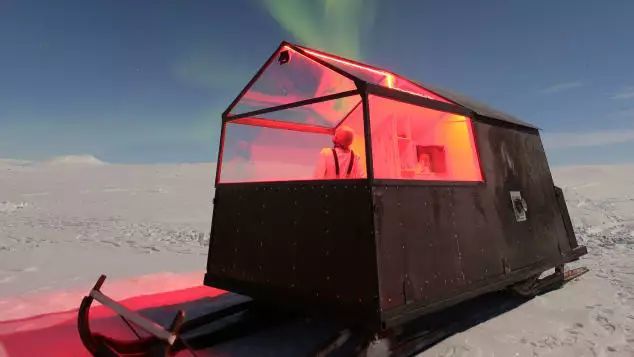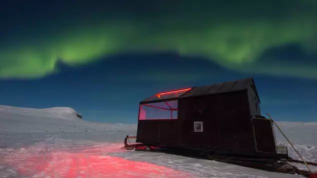 如果你在观赏极光的季节来到芬兰北部与瑞典和挪威接壤的基尔皮斯耶尔维(Kilpisjärvi),或许将看到三座被放置在巨型雪橇上的木屋,它们像是伫立在冰天雪地里的小船,船头由五面玻璃遮挡,在白雪皑皑中散发出温暖人心的红色光芒。这是由当地一家高端旅行公司Off the Map 提供的极光追逐之旅项目。