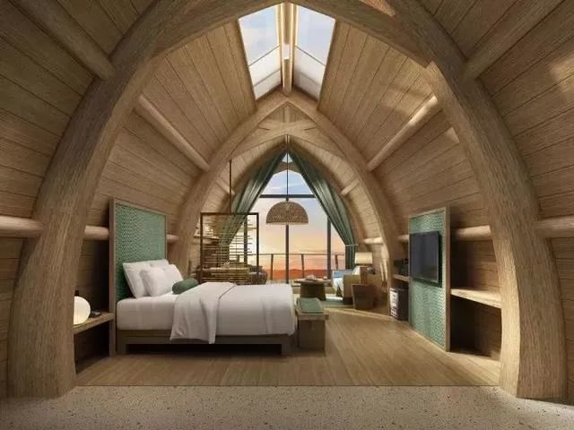 酒店客房建在山野之中,还有许多浮水而立的特色船屋、神秘又彰显个性的树屋、登高远望的大江景房。这里的房间都有着尖顶和圆身,船屋就像一艘江南的乌篷船,半个身子临架在湖面。酒店内还有室内儿童乐园,室外木质滑梯和秋千。无论是大人还是小孩,在这里都能感受到暂离都市、沉浸自然的独特体验。