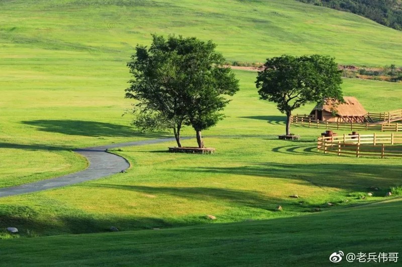 清晨的阳光爬上低缓的山坡,洒在宽阔绿色的草原上,几栋散落的牧舍被阳光照亮,一条蜿蜒的小道和溪流在山谷间绵延,草原上几棵大树刚刚醒来,在温暖的晨光中生机勃勃,像一幅精致的草原油画!