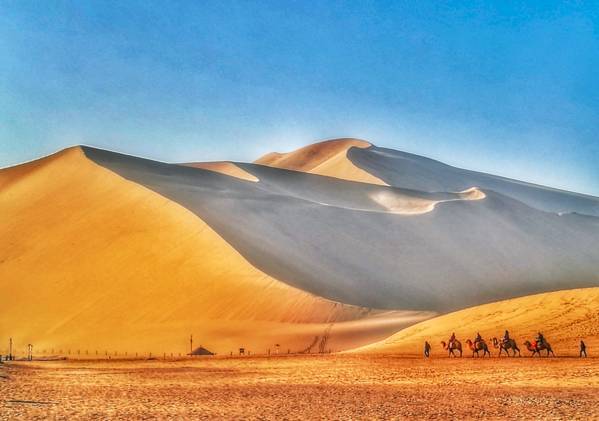 驼队缓缓行进在落日下的大漠,驼铃声鸣响在耳畔,清澈的月牙泉静卧在起伏的鸣沙山中,沙山之上,碧水相依……这样的奇景,任谁见了都难以忘记。