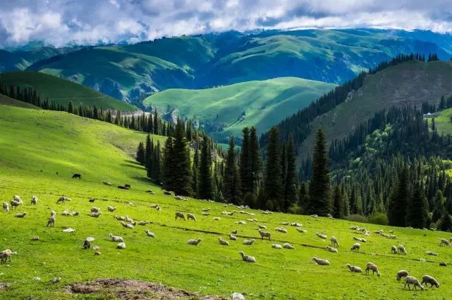在巩乃斯河的上游,是巩乃斯林场所在地,漫山遍野都是松树和野花。 满眼的林密草绿,延绵的山峦,幽静而诗意,云山雪岭,遮天蔽日。